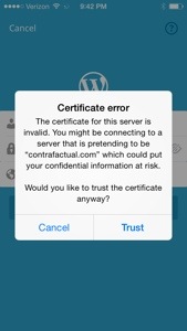 Over the weekend I noticed that the Preview option stopped working. Coincidentally (or was it? … Dunh dunh DAH), I got a warning saying that there was an Invalid Certificate problem with Contrafactual.com.