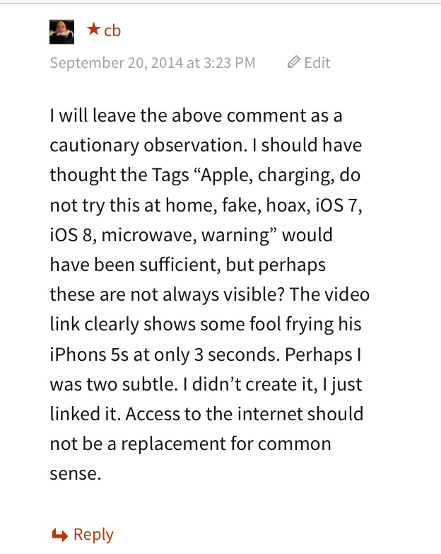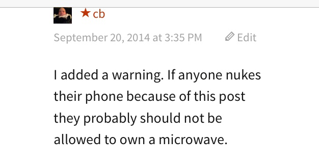 Two days ago, I posted about Wave, an alleged new feature of iOS 8 that allows you to charge your iPhone using a microwave. It is all over the web, I came late to the party. My post had plenty of disclaimers and even featured a video of someone frying their iPhone in just three seconds.