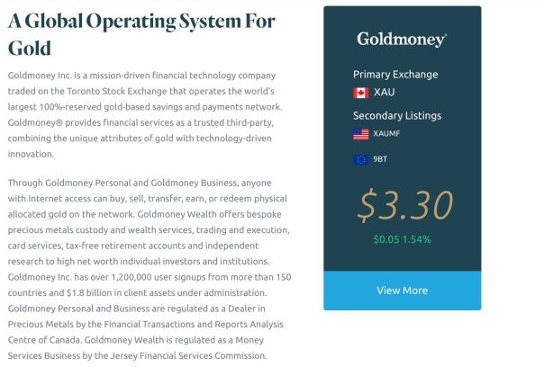 Goldmoney is a game changing FinTech (Financial Technology) company with the goal of making gold useful as money again. Unlike all of the world’s paper (aka fiat) currencies, gold has held its value as money for over 5000 years. Goldmoney gives the average person the ability to save in gold with extremely low and reasonable fees. All gold held in Goldmoney is 100% allocated to users which means that every gram owned by every account user is physically stored in one of several vaults around the globe (you select which ones) and associated with each user. This is not “paper gold”, gold contracts, or gold ETFs. This is real gold. You can take delivery of your gold in a variety of forms (cubes, bars, coins, etc.) if desired. Buying and selling gold and transferring funds to and from your bank is quick and painless. The features and functionality provided by Goldmoney have expanded significantly in the two years or so since the company IPOed, as has its user base and assets under management. As a publicly traded company it is open to the highest levels of oversight and transparency.