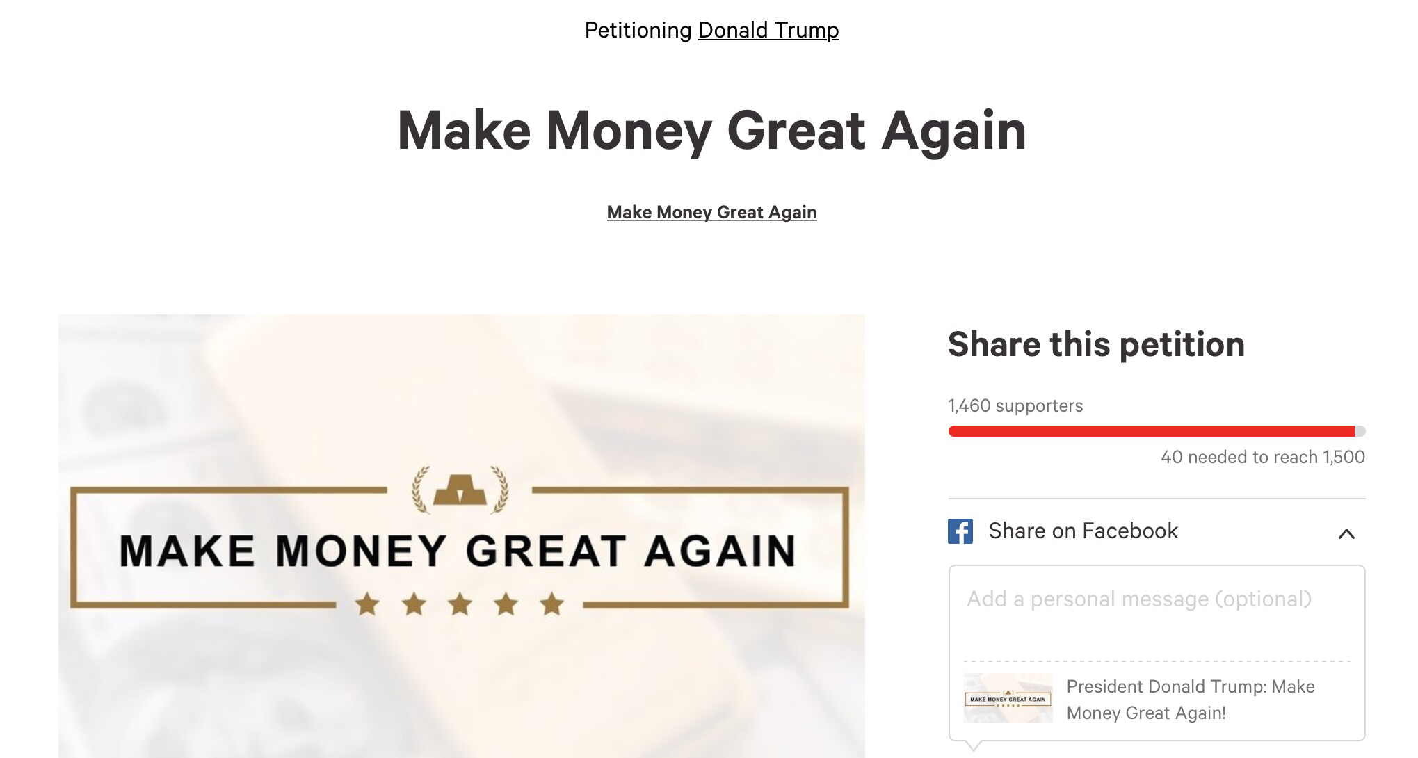 OK so maybe $20 worth of free gold doesn’t sound like much, but where else can you get a 5% instant return on your investment. Furthermore, a quick check of the web reveals that many experts are predicting that gold could go as high as $10,000 per troy ounce ($321/g). So your 10g of gold could grow to be worth $3,210. Finally most financial advisors recommend keeping up to 10% of your wealth in gold as insurance against financial uncertainty. I think you will agree that in our current political climate the risk of financial uncertainty is growing greater with every executive order.