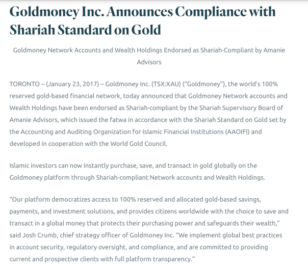 In 2017 Goldmoney Inc. announced that Goldmoney Network accounts and Wealth Holdings had been endorsed as Shariah-compliant by the Shariah Supervisory Board of Amanie Advisors, which issued the fatwa in accordance with the Shariah Standard on Gold set by the Accounting and Auditing Organization for Islamic Financial Institutions (AAOIFI) and developed in cooperation with the World Gold Council. Additionally in 2017 Goldmoney Inc. launched additional payment integrations allowing for direct-to-bank redemptions and credit card processing in Indian rupee for Goldmoney Network.