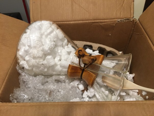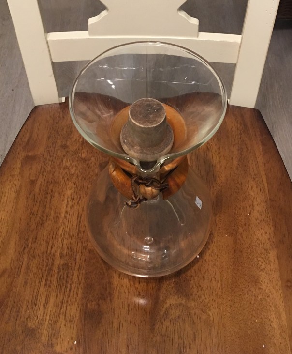 So I did what I should have just done in the first place. I drove to a nearby craft store and bought a length of new leather thong. The CHEMEX is now assembled. Filter paper had previously arrived from Amazon. A bag of whole bean “Christmas Blend” was obtained from the new Starbucks that opened up around the corner.