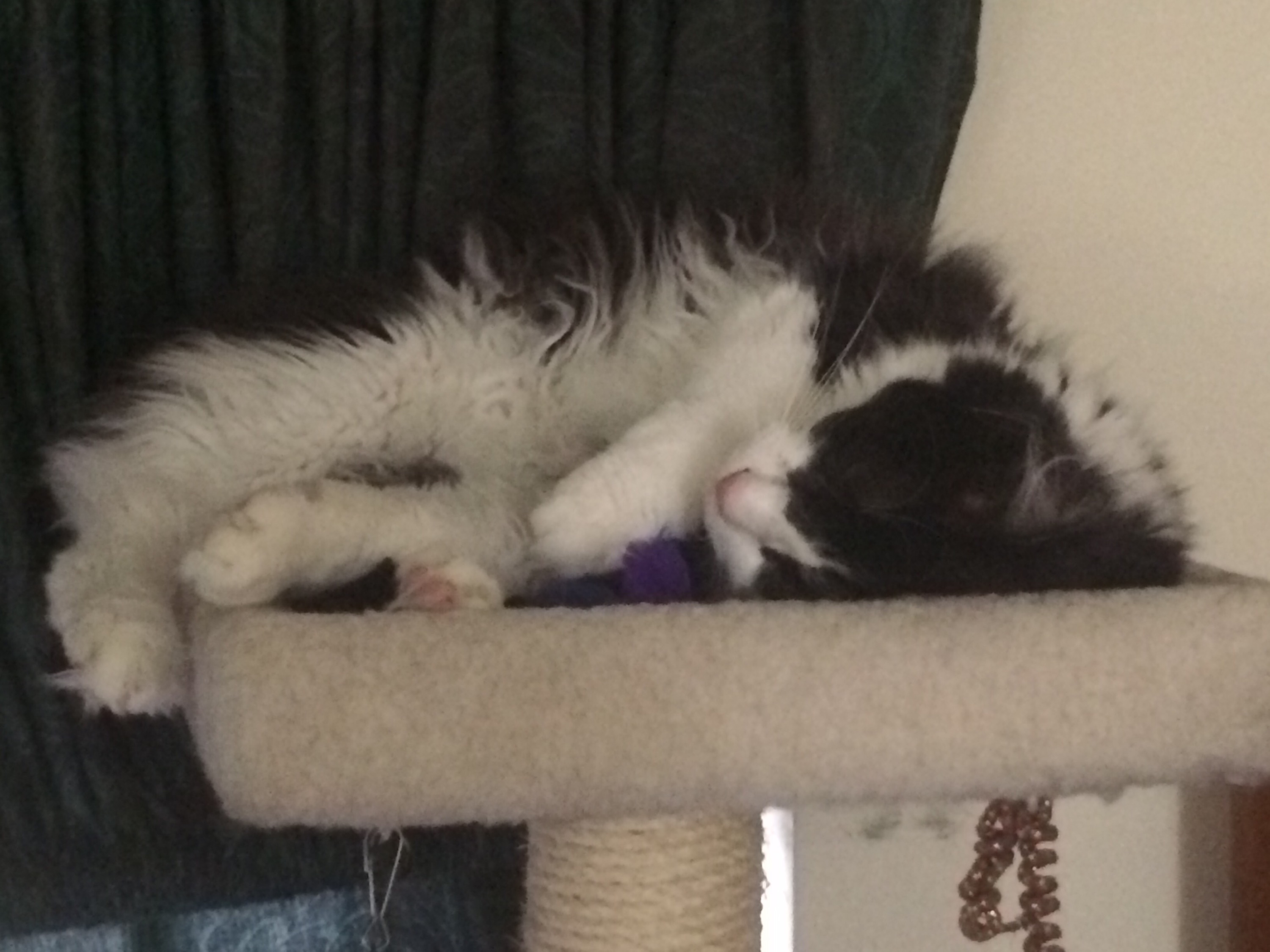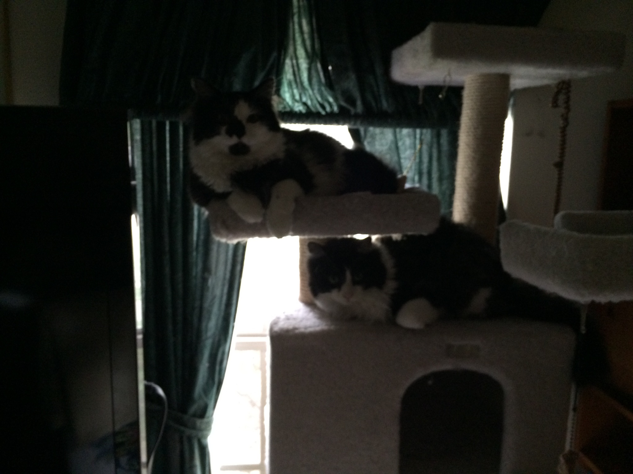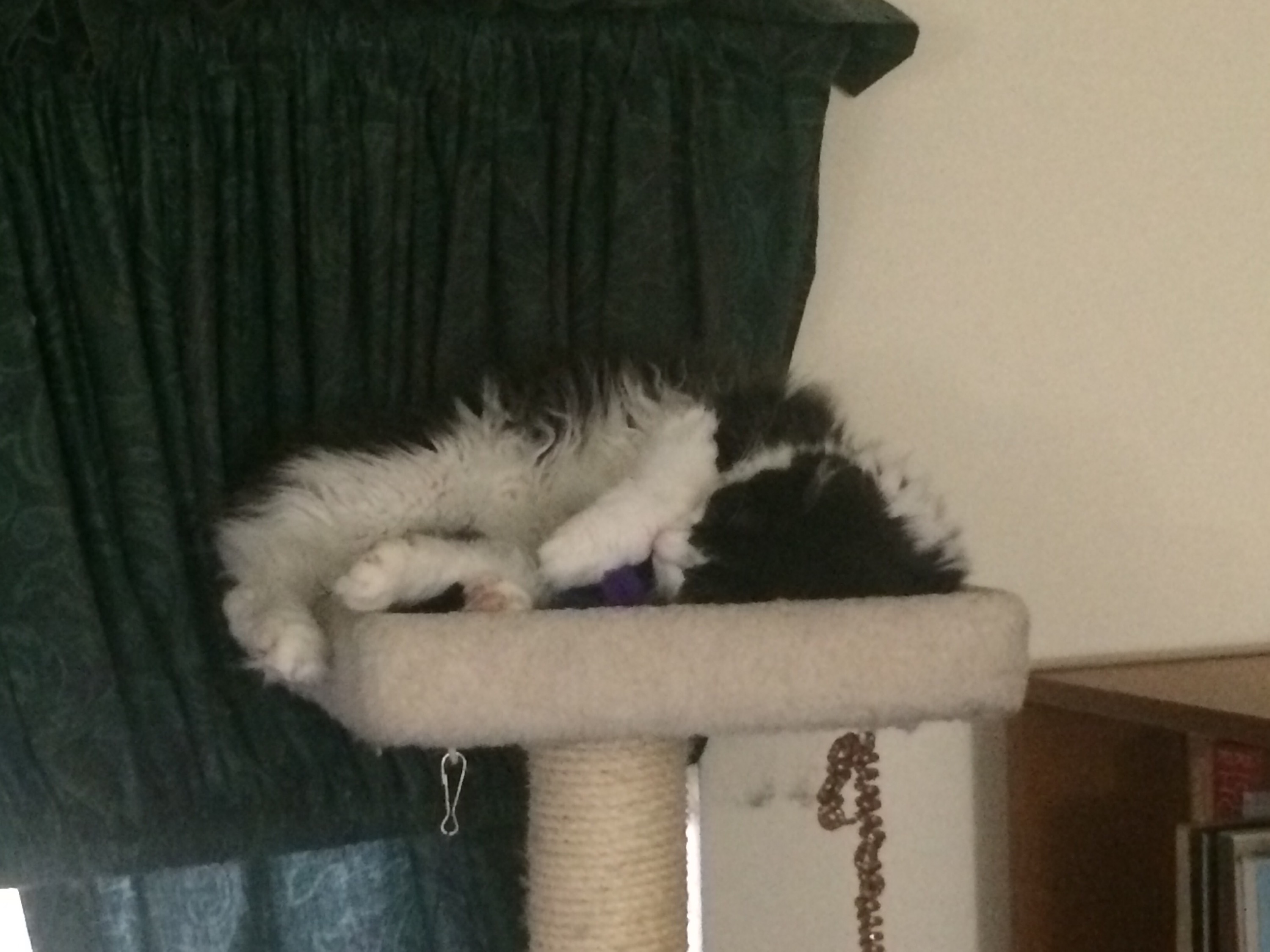 Pickles (left) and Sir Edmund Hillary (right) napping on the cat “tree”.