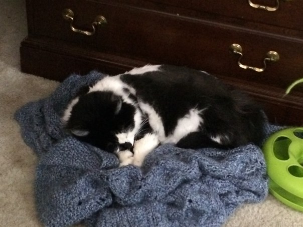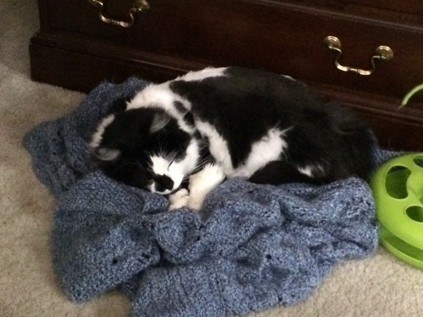 After sufficient smurgling in my lap on His blankie, Hillary snuggles down into the nest between my legs.