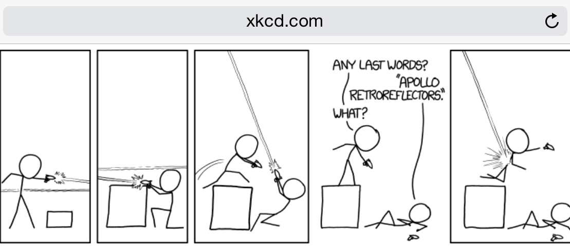 These methods are faster, safer, and infinitely more accurate than measuring distance by stretching a long steel tape (called a chain for historical reasons) as I did in college surveying camp over 30 years ago. Laser range finders and retroreflectors are the mainstay of modern surveying. This technology did not become commercially available until the 1980s, yet NASA used it in 70s to accurately measure Earth-Moon distance.